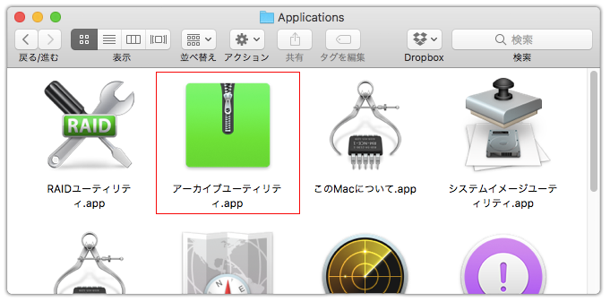 Mac OS 10.12で作成 - 「アーカイブユーティリティ.app」がある場所は、Mac OS 10.9までは、起動HDD直下の[システム]→ [ライブラリ]→[CoreServices]になります。
