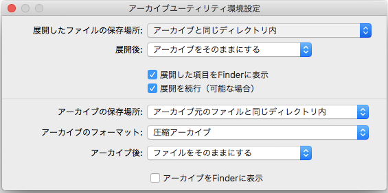 Mac OS 10.12で作成 - 「アーカイブユーティリティ.app」をダブルクリックで起動させ、[環境設定]から、展開後、元のzipファイルをどうするかなど、多少の設定変更が可能です。