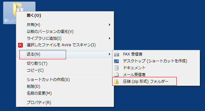 - 表示されたコンテキストメニューから[送る]→[圧縮(zip形式)フォルダー]を選びます。