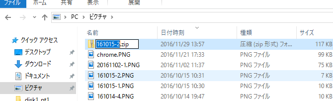 Windows7で作成 - 元のファイルと同じ階層にzipファイルが作成されます。