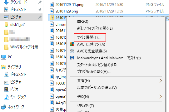 Windows10で作成 - 指定の場所に、伸張されたファイルがすべてコピーされます。