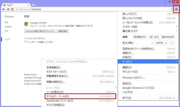 Google Chromeの画面右上の設定アイコンをプルダウンし、[ツール]→ [デベロッパー ツール] を開きます。