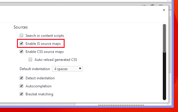 [デベロッパー ツール]の画面右上のギアアイコンをクリックして、[Settings]の画面を表示、[Sources]部分の[Enable JS source maps] にチェックが入っているか確認します(Windows8.1のGoogle Chrome 32.0.1700.76 mの場合)。