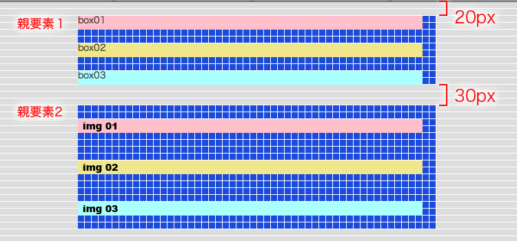また、「親要素1」のbottomのmarginは30pxを指定しています。ブロック子要素の末尾「box03」のbottomのmarginは20pxです。この二つのmarginが相殺され、大きいほうである「親要素1」分の30pxが「親要素1」の下に展開されます。