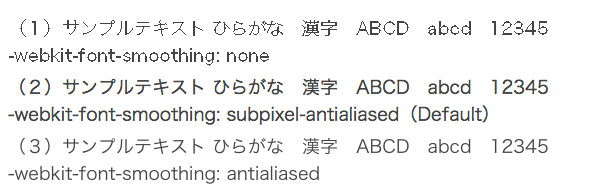 MacのブラウザSafariのテキスト表示に、デフォルトでアンチエイリアスがかかっていることは知られていますが、このデフォルトの状態をCSSで現すと、「-webkit-font-smoothing: subpixel-antialiased」となります。これは元のフォントよりもやや太くなっているそうです。