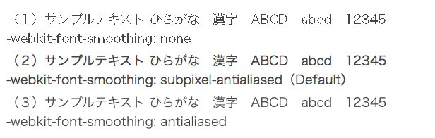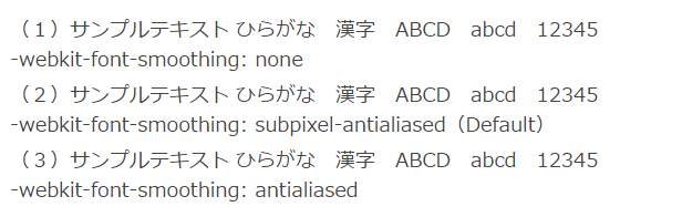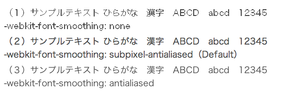 - サンプルの(2)は、デフォルトの「-webkit-font-smoothing: subpixel-antialiased」です。比較するとやや太いということが分かります。