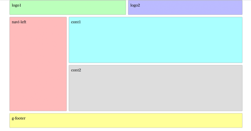 <div class="container"> <div class="item logo1">logo1</div> <div class="item logo2">logo2</div> <div class="item navi-left">navi-left</div> <div class="item cont1">cont1</div> <div class="item cont2">cont2</div> <div class="item g-footer">g-footer</div> </div>