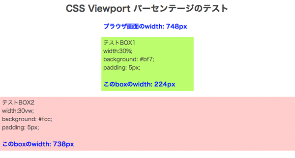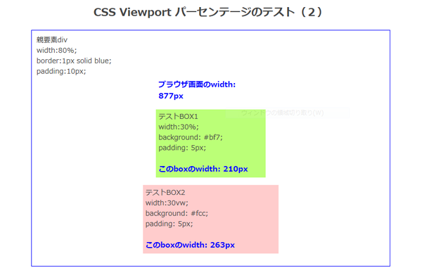 二つboxを重ね、上は、「width:30%」に、下は、「width:30vw」にしてあります。30vwは、viewportで指定(もしくは無指定)したサイズを100 とした割合になるので、30%となり、上のboxも、ここではviewportサイズと同じbodyに対する30%になりますので、対応ブラウザでは、二つのboxは同じ幅に見えます。
