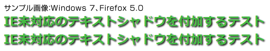 「IE未対応のテキストシャドウを付加するテスト」の上は、テキストシャドウを付加するコードをstrongタグで囲っています。下は、cssでfont-size:bold;にしていますが、無視されるようです。css3の解釈としては、サンプル画像のように両者とも太い文字になるはずですが。