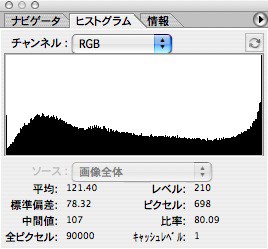 ヒストグラムとは、画像を構成している各ピクセルの輝度の分布をグラフ化したもので、Photoshop等のペイント系、レタッチ系ソフトでよく利用されます。横軸は輝度を表し、左端が輝度0の純黒、右端が輝度255の純白になっています。縦軸は各輝度のピクセルの数です。