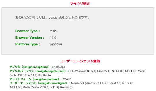 IEの判定は、バージョンが10以前なら従来からの「MSIE」、IE 11なら「Trident」で判別できます。